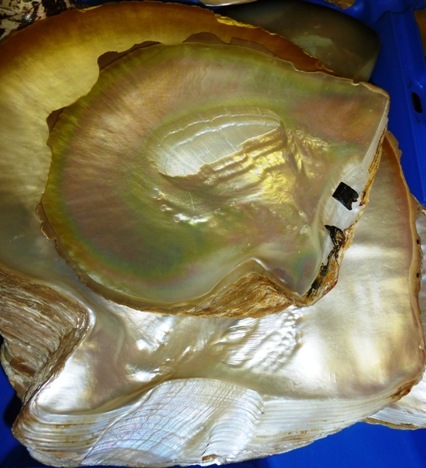 Pearl is produced when shell fish and snails coat the inside of their shells with a secretion called nacre which George described as ‘a sort of spit’. They also coat any bits of grit or sand which get in their shells to stop them from becoming irritants and this produces pearls. The coating on the inside of the shell is called ‘Mother of Pearl’ to distinguish it from the pearls themselves. True pearl comes from oysters and the largest oysters in the world come from Australia so it was after Britain began importing oysters from Australia in the nineteenth century that pearl working developed – making larger items such as cutlery handles from the thicker mother of pearl rather than simply cutting out blanks for buttons or inlay from the thinner small shells previously used. George prefers not to use the largest shells as they often have worm holes and the quality of the pearl is not as good as in the medium sized shells which he favours, most of which he buys as by-products from the cultured pearl industry.