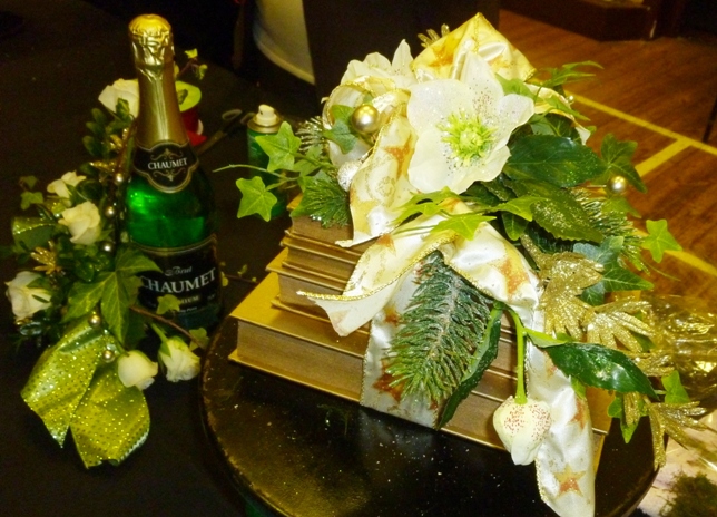 The last arrangement of the evening was put together with all artificial material. Ann used a heart shape and attached a piece of dry oasis. She then arranged bows and Christmassy sprigs to form a very attractive hanging. Elsie's arrangement was very original. Four hard backed books- charity shop finds- had been sprayed gold, stacked up, glued and tied together with decorative ribbon. Dry oasis was fixed to the top. This was then covered with moss. As with Ann's arrangement, bows and other trimmings were then used to create a very stylish arrangement. Ann and Elsie's original demonstration was very enthusiastically applauded. They both showed how a beautiful arrangement can be achieved for a modest sum of money. We all went away keen to have a go ourselves. Raffle ticket sales also went up this week as the arrangements were the prizes. We all eagerly anticipated the draw.